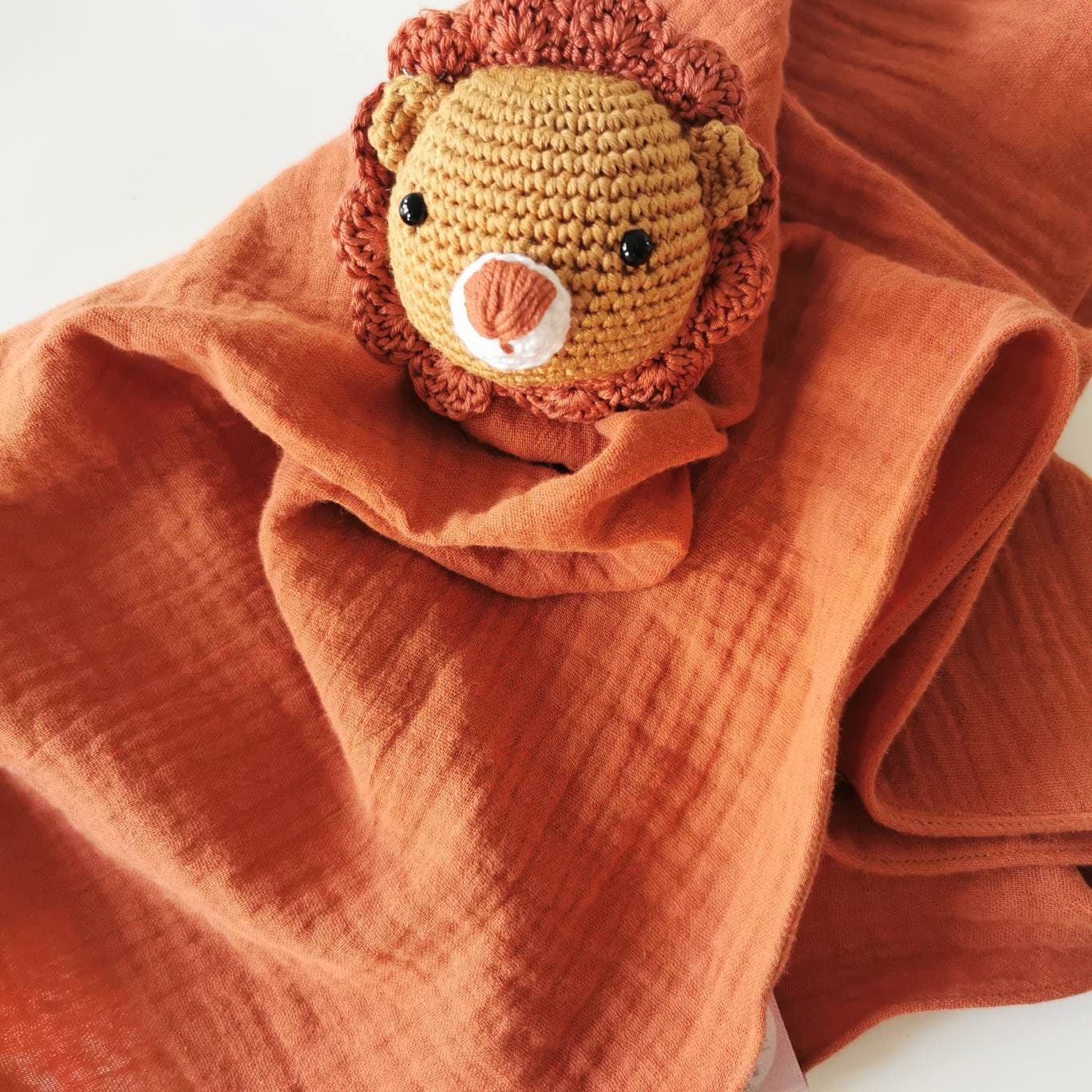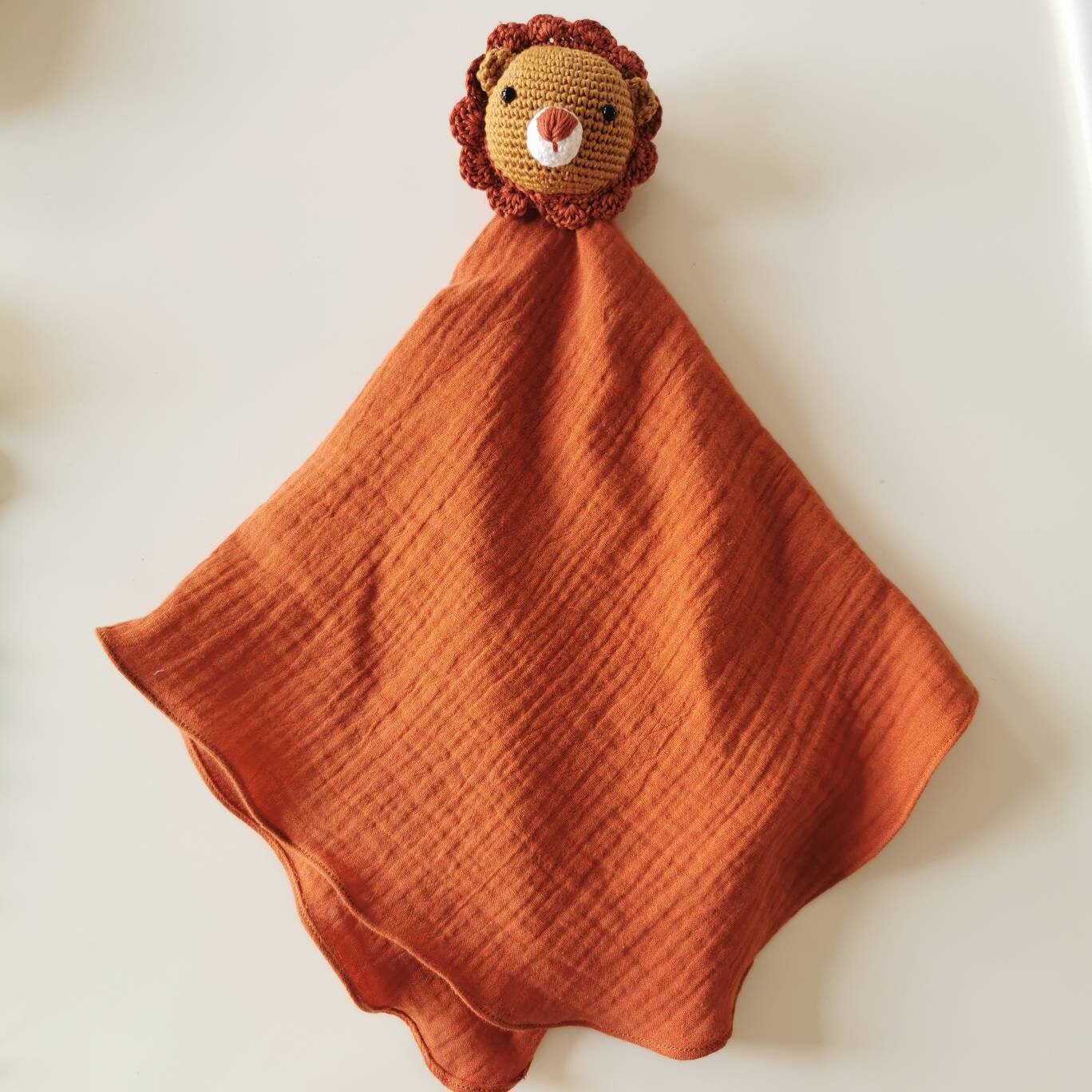 Cuddly cloth made of muslin fabric and a crocheted animal head