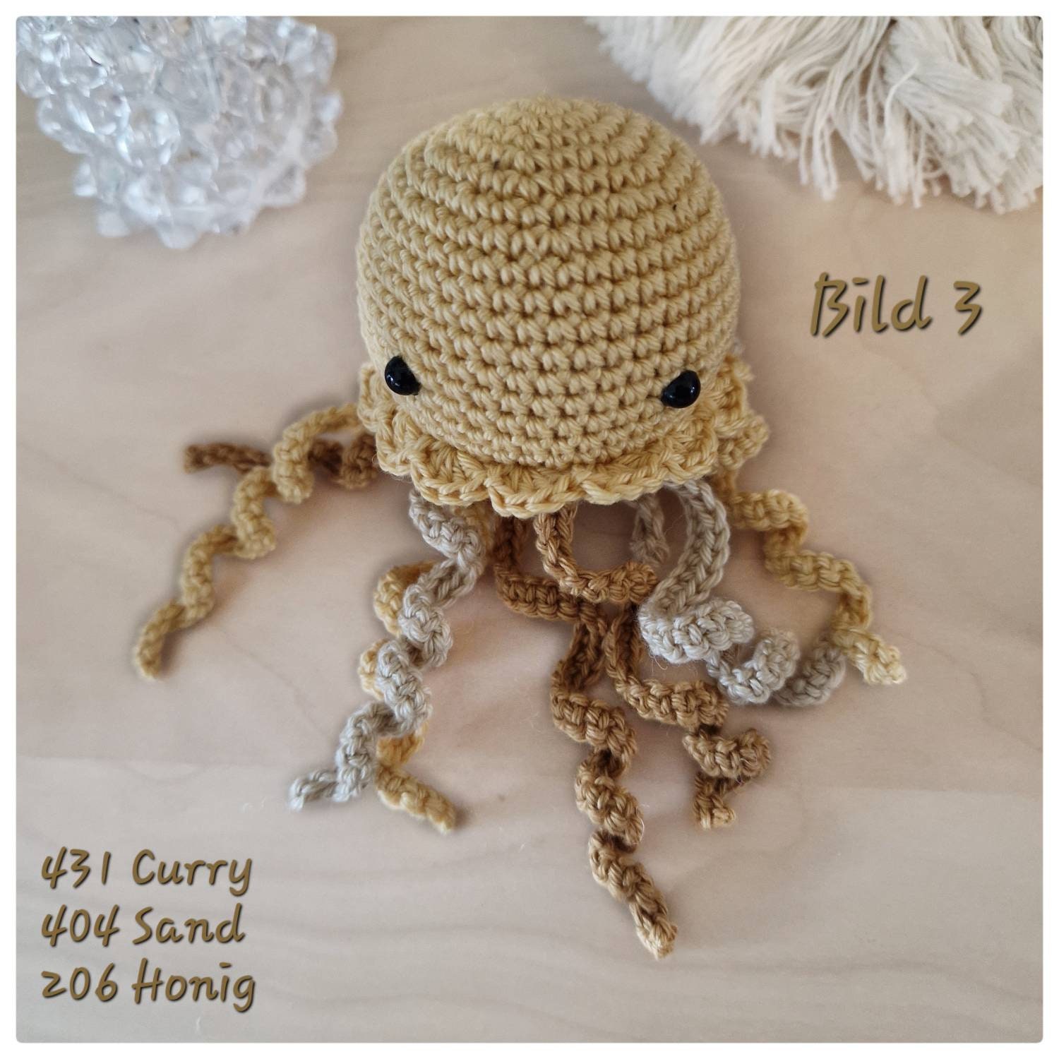 The hand-crocheted music box is made of cotton. In addition, the mechanism and the filling material inside are made of OköPolyester.