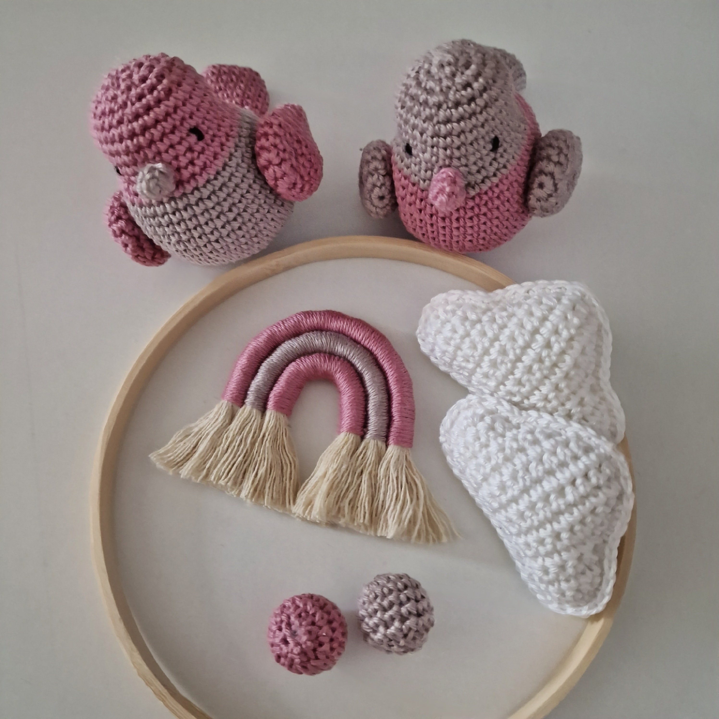 This baby mobile with its cute bird and rainbow charms is the perfect toy for your baby! The soft colors and sweet designs will delight your child and stimulate their senses. The mobile can be easily attached to the ceiling or crib and is made of high-quality materials that are safe and durable. This baby mobile makes an excellent gift for new parents and will provide hours of fun for you and your baby. Order now and experience the quality of this toy for yourself! The diameter is 15 cm and the length is approximately 47 cm, making it an ideal fit for a four-poster bed. The length can be varied as desired.